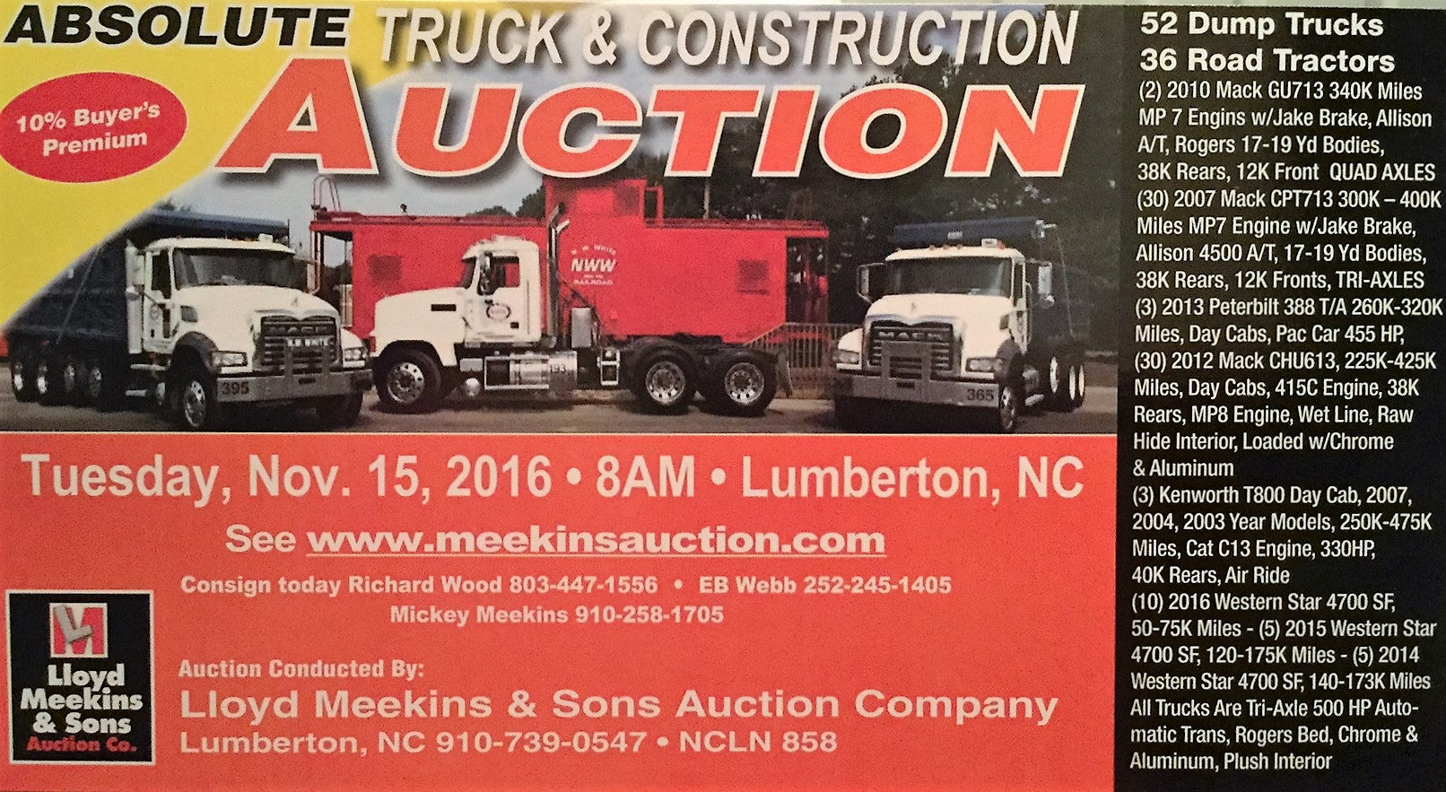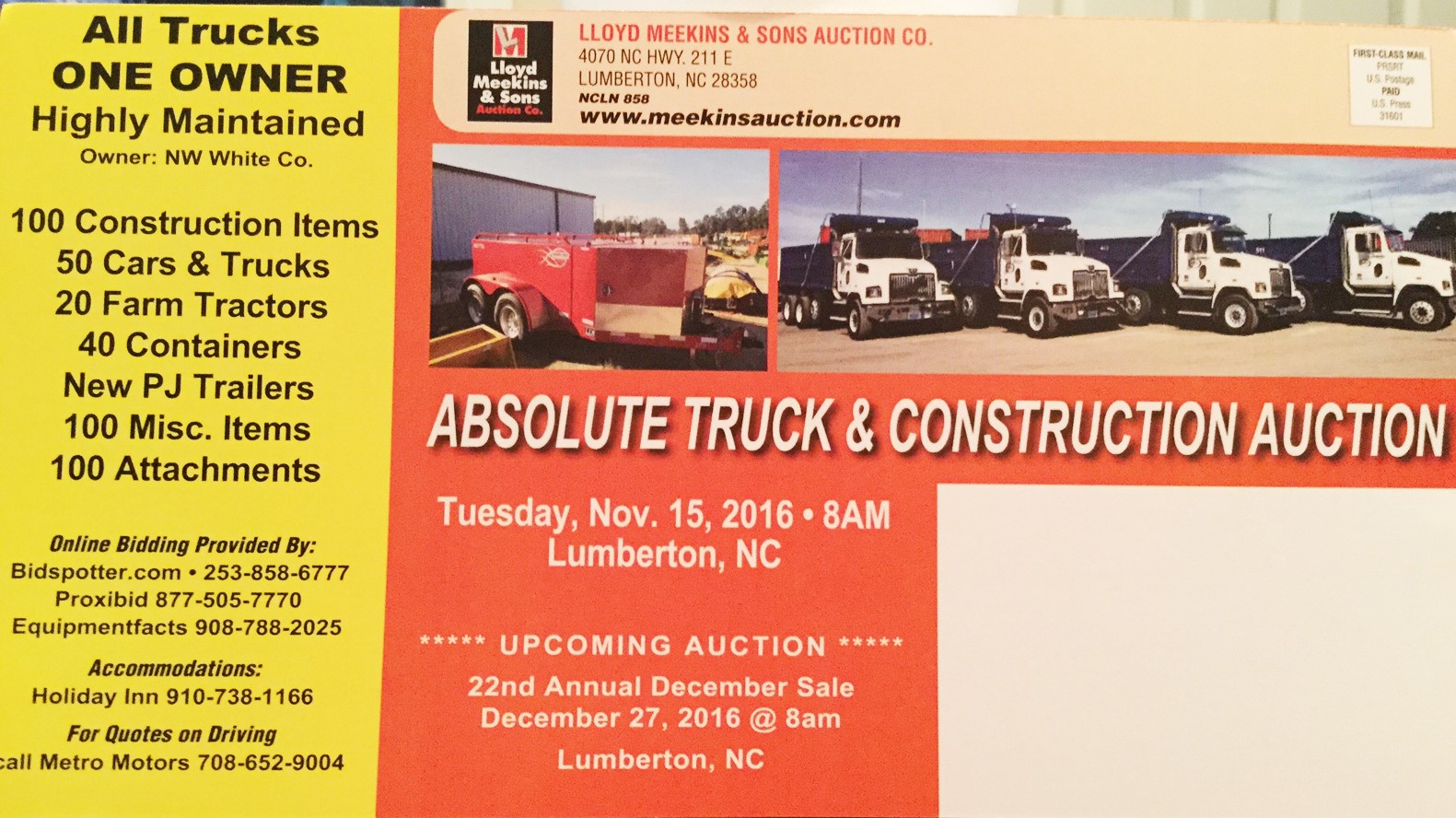 Lloyd Meekins & Sons Auction Company – Lumberton, NC (910) 739-0547 NCLN 858 See www.meekinsauction.com Richard Wood (803) 447-1556 ? Mickey Meekins (910) 258-1705 EB Webb (252)245-1405 Online Bidding Provided By: Proxibid.com (877) 505-7770 Bidspotter.com (253) 858-6777 Accomodations: Holiday Inn (910) 738-1166 For Quotes on Driving call Metro Motors (708) 652-9004